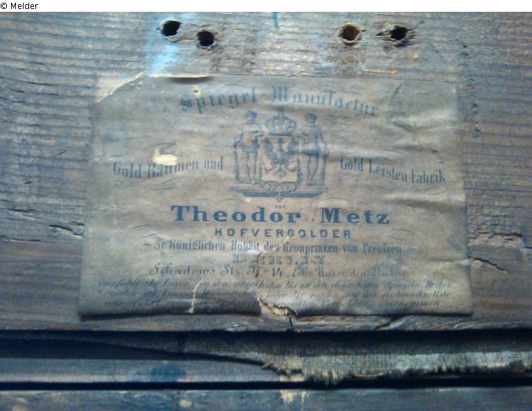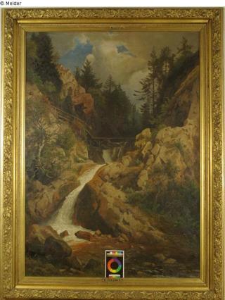 Gebirgslandschaft mit kleinem Wasserfall, auf einer Brücke ein Wandersmann der, auf das Geländer gestützt, nach unten blickt; Rahmen, vergoldet; Rückseitig: Stempel und Beschriftung, teilw. unleserlich: Stempel (aus der Zeit nach 1945): "Hauptkulturamt/ Hauptstadt Berlin/ Bildende Kunst ___ Nr. 2238"; handschriftlich: "____wzune Palais"