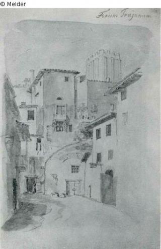 Fundmeldung Blick in eine Gasse beim Forum Trajanum, Rückseite: Osteria Hersteller/Künstler:in Führich, Josef von Objektart Zeichnung Material / TechnikBleistift / gezeichnet (Feder)Lost Art-ID219368