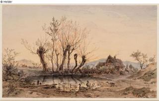 Fundmeldung Teich mit Gänsen, Weiden und hinten Bauernhof Hersteller/Künstler:in Hasse, Ernst Objektart Zeichnung Material / TechnikTusche schwarz ; Wasserfarbe ; Papier / gezeichnet (Feder)...Lost Art-ID623323