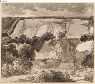 Fundmeldung Wasserfall neben Ruinen, vorn links Beobachter Hersteller/Künstler:in Kobell, Franz Innocenz Josef Objektart Zeichnung Material / TechnikFarbe schwarz, braun ; Graphit / gezeichnet (Feder)...Lost Art-ID579261