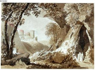Fundmeldung Landschaft mit Burg, rechts zwei Gestalten vor Felsen Hersteller/Künstler:in Kobell, Franz Innocenz Josef Objektart Grafik Material / TechnikGraphit ; Farbe sepia / gezeichnet (Pinsel) ; laviertLost Art-ID579267