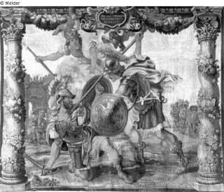 Fundmeldung Achill tötet Hector (Tapisserie: Hektor und Achill) Hersteller/Künstler:in Leefdael, Jan van Objektart Gebrauchs- / Raumtextilie Material / TechnikTextil (Wolle) ; Textil (Seide) / BildwirkereiLost Art-ID219868