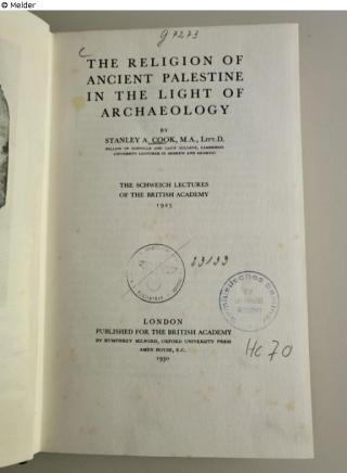 Fundmeldung The Religion of ancient Palestine in the light of archaeology Autor:in Cook, S. Verlag Milford Objektart Buch Lost Art-ID632670