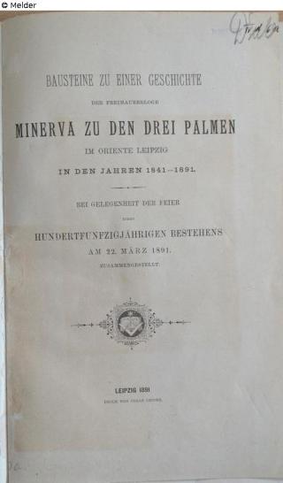 Fundmeldung Bausteine zu einer Geschichte der Freimaurerloge Minerva zu den drei Palmen Leipzig in den Jahren 1841-1891. Bei Gelegenheit der Feier ihres Hundertfünfzigjährigen Bestehens am 22. März 1891 zusammengestellt Drucker:in Oskar Leiner Objektart Buch Lost Art-ID634329