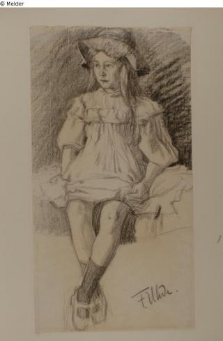 Fundmeldung Sitzendes kleines Mädchen mit Hut Hersteller/Künstler:in Uhde, Fritz von Objektart Zeichnung Material / TechnikPapier ; Kreide / gezeichnetLost Art-ID421723