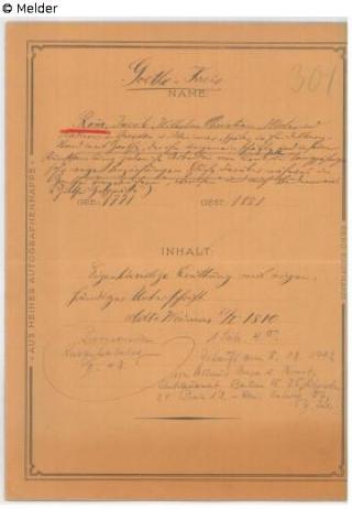 Fundmeldung Brief Verfasser:in Goethe, Johann Wolfgang von Objektart Brief / Postkarte Lost Art-ID623179