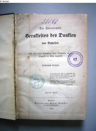 Fundmeldung Die Philosophie des Herakleitos des Dunklen von Ephesos. Nach einer neuen Sammlung seiner Bruchstücke und der Zeugnisse der Alten dargestellt. (2. Band) Autor:in Lasalle, Ferdinand Objektart Buch Lost Art-ID459305