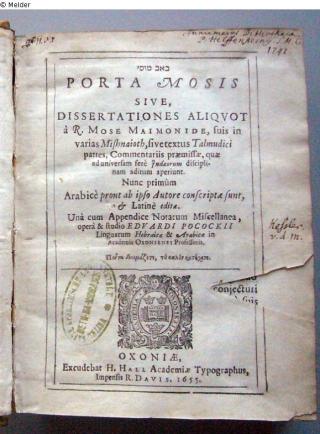 Fundmeldung [Bab Musi] באב מוםי Porta Mosis, sive, Dissertationes aliquot à R. Mose Maimonide, suis in varias Mishnaioth, sive textus Talmudici partes, Commentariis praemissae, quae ad universam ferè Judaeorum disciplinam aditum aperiunt. Nunc primùm Arabicè prout ab Autor:in Moses ben Maimon (Maimonides) Herausgeber Pococke, Edward (Übers./Hg.) Verlag Excudebat H. Hall Academiae typographyus impensis R. Davis Objektart Buch Lost Art-ID520842