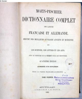 Fundmeldung Dictionnaire complet des langues Française et Allemande. (Résumé des meilleurs ouvrages anciens et modernes sur les sciences, les lettres et les arts... quatrième edition.) Tome premier. Autor:in Mozin-Peschier Verlag J. G. Cotta Objektart Buch Lost Art-ID520856