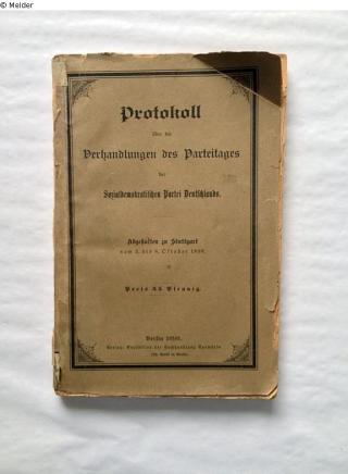 Fundmeldung Protokoll über die Verhandlungen des Parteitages der Sozialdemokratischen Partei Deutschlands. (Abgehalten zu Stuttgart vom 3. bis 8. Oktober 1898) Drucker:in Max Bading, Berlin Verlag Expedition der Buchhandlung Vorwärts Objektart Buch Lost Art-ID520883