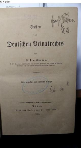 Fundmeldung System des Deutschen Privatrechts Autor:in C. F. v. Gerber Verlag Mauke Objektart Buch Lost Art-ID606635