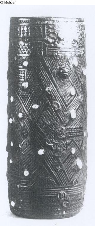 Suchmeldung Schwarzer Köcher mit weißen Steineinlagen auf reliefiertem Muster Hersteller/Künstler:in Unbekannt (Kongolesisch) Objektart Kunsthandwerk / -gewerbe Material / TechnikHolz ; SteinLost Art-ID388588