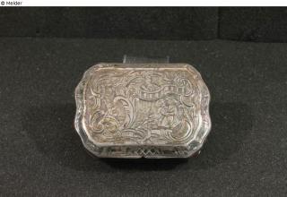 Fundmeldung Tabakdose Hersteller/Künstler:in Thomsen , Johann Hinrich Objektart Behältnis Material / TechnikMetall ; Metall (Silber) / montiert ; getrieben ; graviert...Lost Art-ID626420