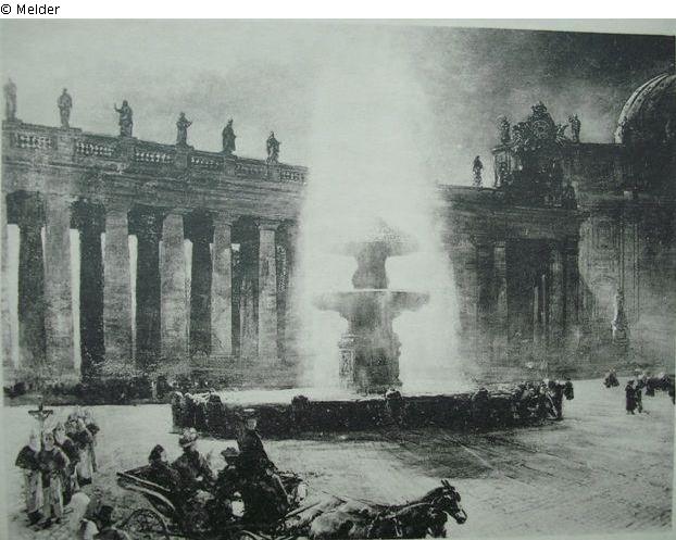 Der Platz liegt in silbrig-blauem Mondlicht, das auf dem Wasser der Fontäne kräftige Reflexe hervorruft. Auf dem Platz eine Equipage, Spaziergänger und ein Zug von Dominkanern. Als Abschluß - fast schon silhouettenhaft wirkend - die mächtigen Arkanden des Bernini und ein Teil der Fassade von St. Peter. Signiert