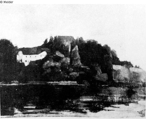 Blick über einen Flußlauf auf das mit Basaltfelsen und Tannendickicht besetzte Steilufer. Links ein großes Klostergebäude. Am blassblauen Himmel Abendwolken. Monogramm