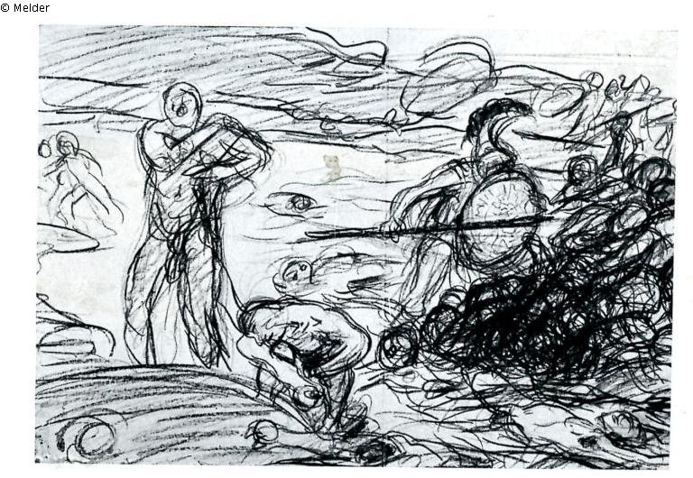 „Rachetrunken wegen des Todes von Patroklos dringt Achilles ins Heer der Trojaner und metzelt alle Gegner nieder. Um Achills Wüten zu entgehen, flieht ein Teil der Trojaner stadtwärts. Ein anderer flüchtet ans Ufer des Flusses Skamandros und hatte dort Schutz unter der überhängenden Böschung gesucht. Als Achill sie entdeckt, lehnt er seine Lanze an einen Tamariskenstrauch, zieht sein Schwert [in dieser Skizze hat er noch die Lanze als Waffe] und ein grässliches Abschlachten beginnt. Geschrei und Geröchel war lauter als das Tosen des Wassers, das sich rot gefärbt hatte. Nachdem er das Schwert nicht mehr halten konnte, fing er mit seinen Händen zwölf Jünglinge ein, um Sie als Götter-Opfer auf dem Scheiterhaufen für den toten Freund Patroklos zu verbrennen“ (UW)