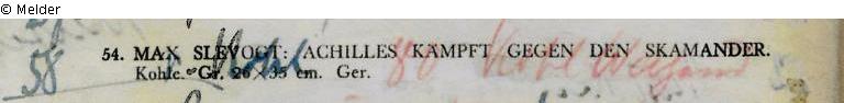 Sammlung Eduard Fuchs bis 1933; 25.10.1933 Beschlagnahmung durch die Gestapo; 16. und 17.06.1937 Versteigerung Rudolph Lepke Katalog 2114, Nr. 54: „Achilles kämpft gegen den Skamander. Kohle, Größe 26 x 35 cm. Gerahmt.“; ersteigert von dem Slevogt-Sammler Franz Josef Kohl-Weigand für 58,- RM; seit 1937 Sammlung Kohl-Weigand, St. Ingbert; seit 1980 Saarlandmuseum Saarbrücken, Graphische Sammlung (KW 60 Z) - Restitutionsverhandlungen sind eingeleitet
