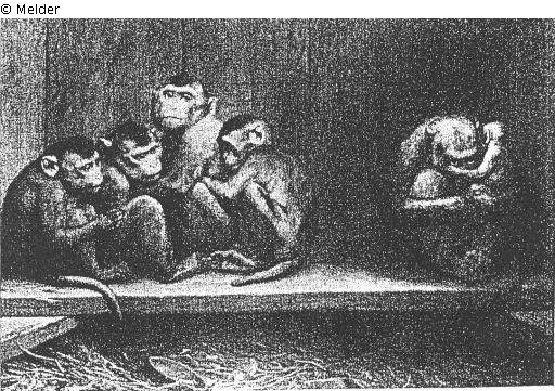 auf einem Brett links vier Meerkatzen, rechts Affenmutter mit ihren Jungen; signiert