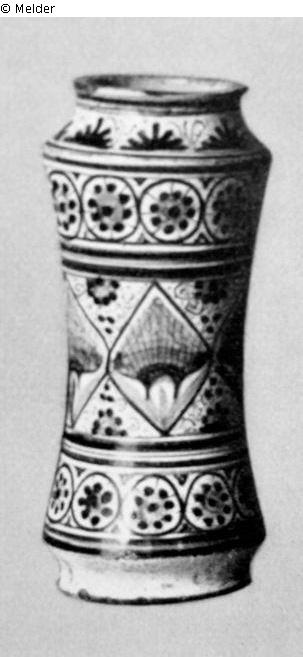 hoher, schlanker Albarello. Bemalt auf weißem Grund in drei Zonen mit stilisierten Rosettenreihen und gefiederten Pfauenfedern in Rhomben in Blau, Gelb und Grün.