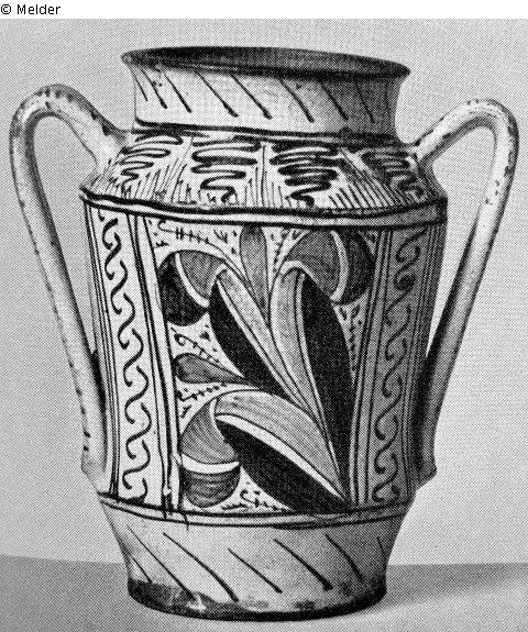 weiß glasiert, bemalt blau und grün mit floralem Ornament.