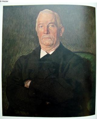 Vor grünem Hintergrund sitzt auf grünem Polstermöbel, lebensgroß bis zu den Hüften dargestellt, ein alter, aber noch rüstiger Mann im schwarzen Rock mit untergeschlagenen Armen, Kopf und Blick geradeaus. Das glatt rasierte ausdruckvolle Gesicht ist von grauem Haar umrahmt, der faltige Hals tritt über den weißen Umlegekragen hervor. Bez. r.o.: F. Boehle 1898; ausgestellt 1901 in Dresden, Große Kunstausstellung; farbig reproduziert in "Die Rheinlande"