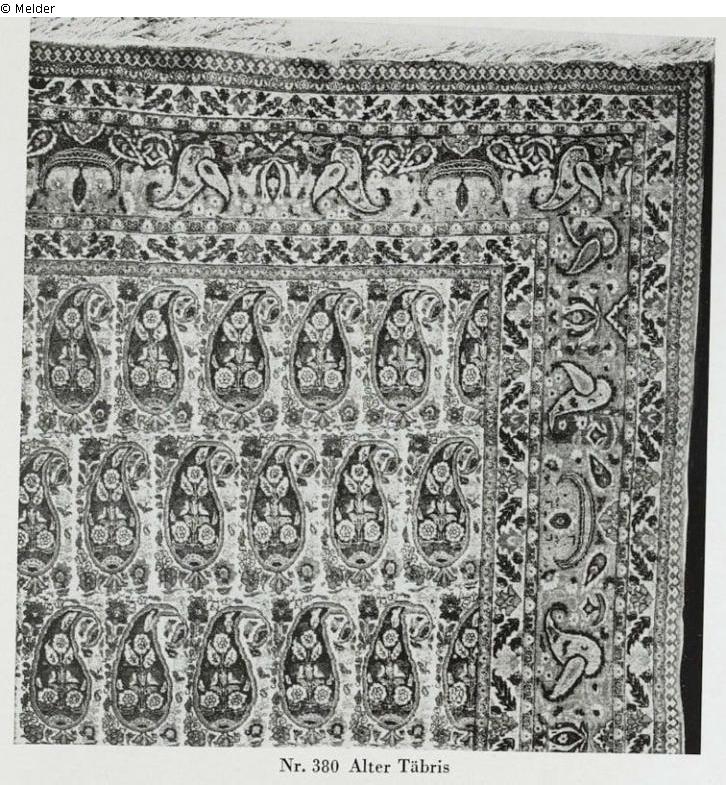 mit Palmettenmuster in Eisenrot und schwarz sandfarbenem Grund. Breite Borte mit stilisierten Blumen und Blattranken in denselben Farben, aber auf hellblauem Grund. Ganz enge Knüpfung und vorzügliche Erhaltung. Ehemals Sammlung Baronin Mathilde v. Rothschild