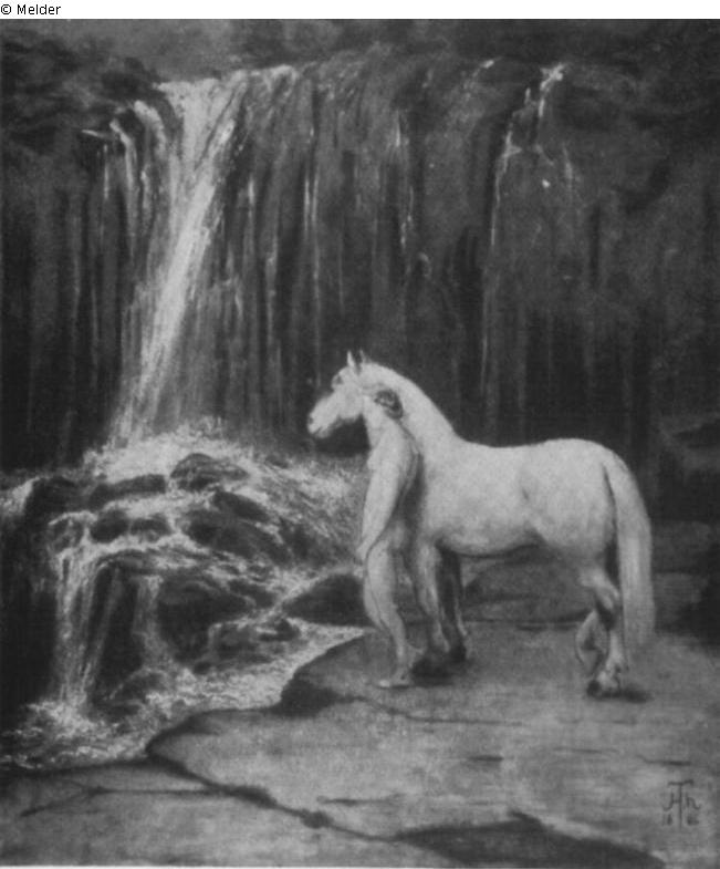 nackte Frau steht neben ungesatteltem, ungezäumtem Pferd vor dunkler Felsengrotte, über die ein Wasserfall herabstürzt, bez. u. r.: H. Th. 86