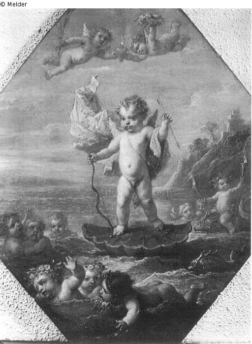 Amor auf einer Seemuschel reitend, mit Putten auf dem Meer, sign.