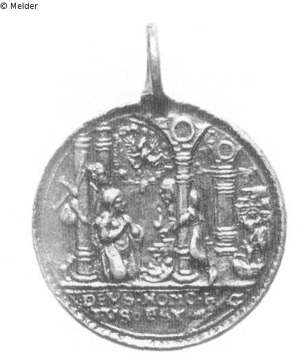 Medaille, gehenkelt. Vs.: Zwischen vier Säulen kniet Maria vor dem auf dem Boden liegenden Kind. Hinter ihr steht Joseph und ihm gegenüber ein Hirte, beide umfassen die Schäfte von Säulen. Am Himmel schwebt der Verkündigungsengel, und ganz rechts sieht man den Ochsen und den Esel. Im Abschnitt die Inschrift DEVS HOMO FAC / TVS EST Rs.: Anbetung der Könige. Im Abschnitt die Inschrift GENTES IN CHR : / SPERANT : / 1 5 6 7