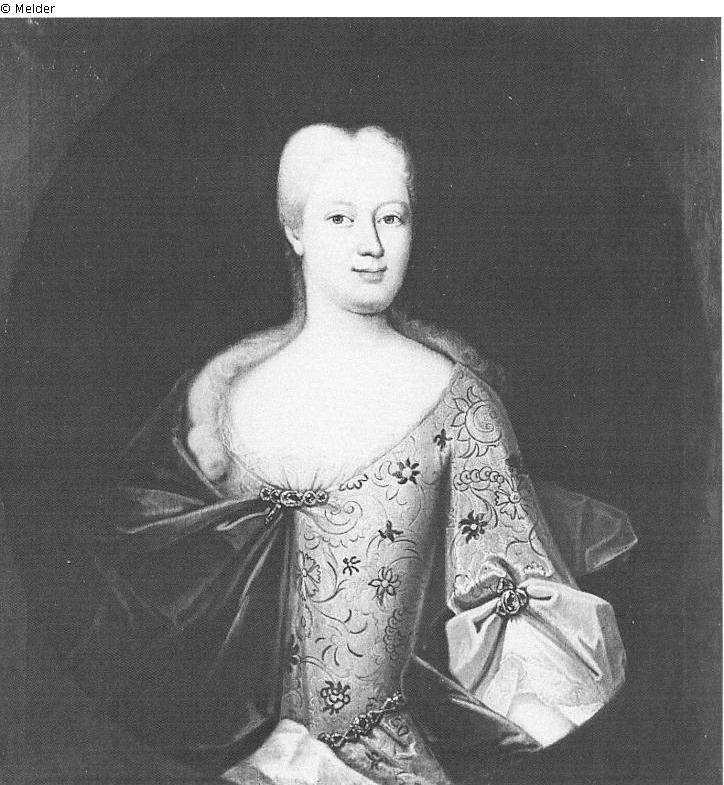 Das halbfigurige Porträt einer jüngeren Frau, die den Betrachter direkt anzusehend scheint, gekleidet in ein rund weitausgeschnittenes, streng tailliertes Brokatgewand mit Stickereiverzierungen und einem in kantigen Falten endenden Ärmel, darüber ein mit einer kostbaren Spange im Brustbereich befestigter dunkler Umhang vor dunklem Hintergrund; enganliegende Frisur mit offenbar blonden Zöpfen. „Ein in Farbe und Modellierung kraftvolles Bild aus der Schule des französischen Malers Antoine Pesne, ...“ Und: „Das zarte Gesicht zeigt ausdrucksvolle Augen. Sie trägt ein schön gestaltetes Kleid, welches aus Seide besteht. Man erkennt auf dem Kleid Blumen- und Fantasieornamente, der Halsausschnitt ist mit Spitzen besetzt. Sie trägt einen Umhang aus Seide.“ (Hammerschmidt 2001).
