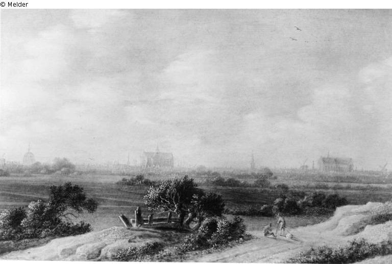 Ansicht von Leiden. Helle, grünliche Landschaft. Im Vordergrund breite Niederung am Wasser mit Gebüsch und lagernden Bauern. Im Hintergrund Panorama von Leiden.