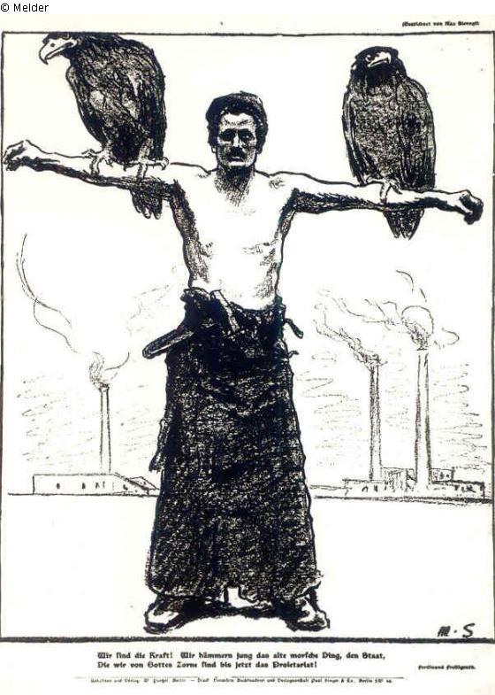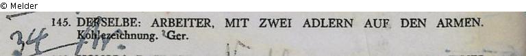 Auftragsarbeit von Eduard Fuchs, der im Berliner Vorwärts-Verlag die Maifestzeitungen herausgab - Sammlung Eduard Fuchs von 1903 bis 1933; 25.10.1933 Beschlagnahmung durch die Gestapo; 16. und 17.06.1937 Versteigerung Rudolph Lepke Katalog 2114, Nr. 145: „Max Slevogt: Arbeiter mit zwei Adlern auf den Armen. Kohlezeichnung, Ger.[ahmt]“; ersteigert von dem Lepke-Kommissionär Carl Braunstein (Berlin-Lichtenrade, Straße 6a Nr. 25) für 34,- RM; Verbleib unbekannt
