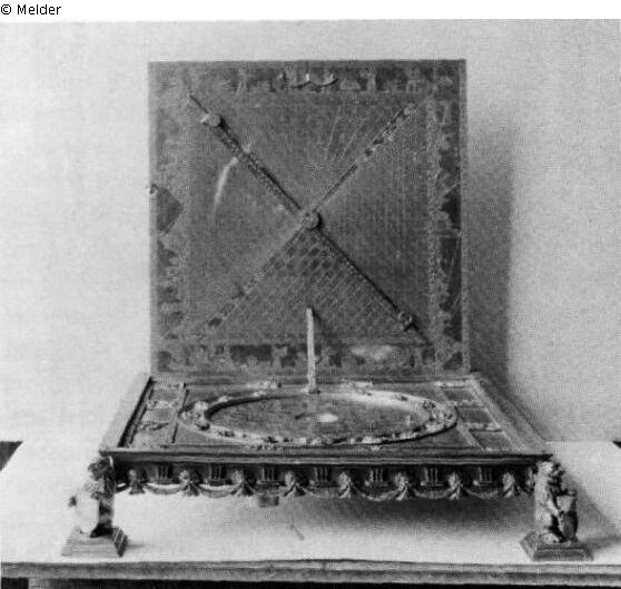 Zweiteiliges, quadratisches Astrolabium auf vier Füssen in Gestalt kauernder Löwen. Deckel und Boden sind an einer Quadratseite mittels Scharnier verbunden. Auf der Außenseite des Deckels eine Vertikalsüduhr; die Stundenziffern stehen auf einem schmalen Band, das rechts und links gerade - und unten nach oben gewölbt ist; aufklappbarer Polstab; innerhalb des Stundenbandes eingravierte Weltkarte (mit Europa, Vorderasien, Nordafrika, östlichem Nordamerika); rechts und links des Stundenbandes die Tierkreiszeichen, oben und unten Sternbilder. Deckelinnenseite durch Diagonalen in Viertel aufgeteilt; oben Himmelshäuser und Planeten als Stundenregenten, unten graphische Umrechnungstafel für italienische, böhmische und nürnberger Stunden; um den Mittelpunkt drehbare, durchgehende Regel mit den Inschriften ""LINEA FIDVCIAE"" und ""PARS HVIVS LINEAE HYPOTHENVSAE""; an den Rändern breite Streifen mit gravierten Szenen, astronomische Beobachtungen und geometrische Messungen darstellend. Auf der Innenseite der Bodenplatte von breitem Streifen mit 16 reliefierten, pustenden Äolusmasken gerahmte, runde, eingravierte Deutschlandkarte mit Nürnberg als Mittelpunkt und kleiner, abnehmbarer Scheibe, unter der sich ein eingelassener Kompaß befindet; quadratisch umlaufender Rahmen mit Fußsonnenuhr in Gestalt von 12 Tabellen (für jeden Monat), die durch reliefierte Szenen (jeweils Darstellungen jahreszeittypischer Beschäftigungen in Landwirtschaft und Weinbau) voneinander getrennt sind.