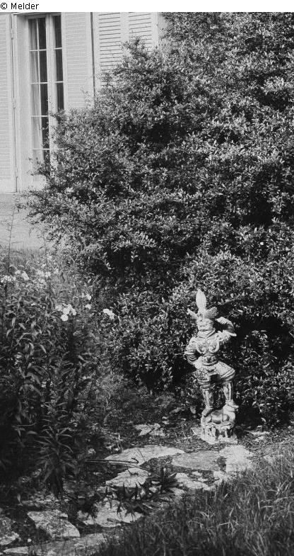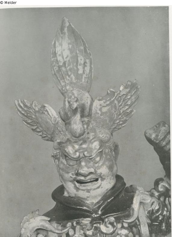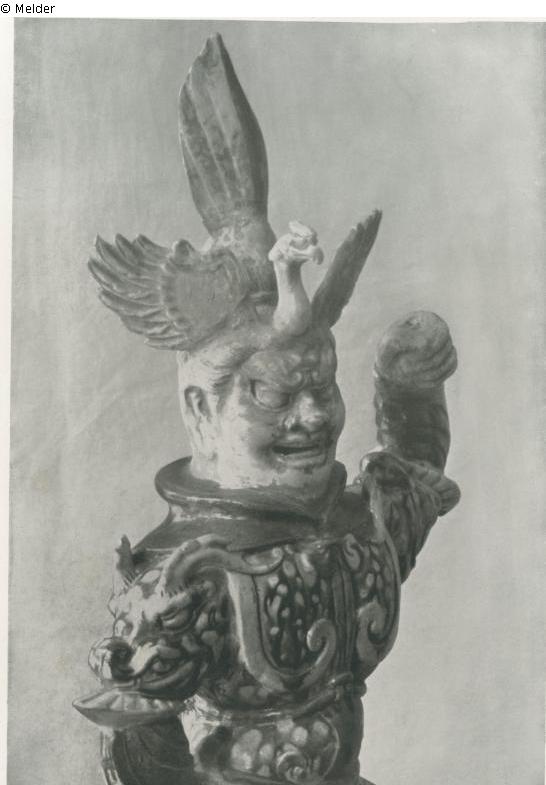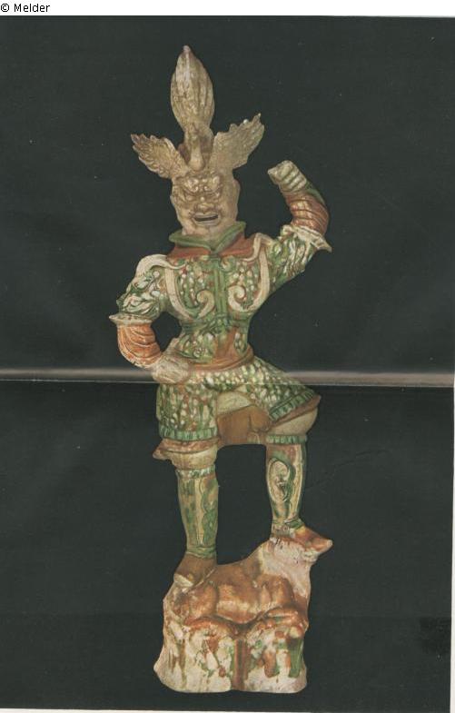 Fuchs-Text zu Tafel 03: „Gott des Westens (auch Lokapala genannt). Einer der vier Himmelskönige steht triumphierend und mit drohender Geste auf einem Stier (das Symbol des von ihm überwundenen Bösen). Der linke Arm, mit dem er ursprünglich wohl einen Speer führte, ist erhoben, den rechten hat er energisch in die Hüfte gestemmt. Als Kopfschmuck trägt er den Vogel Ho mit ausgebreiteten Flügeln. Hieraus ergibt sich, dass diese Figur als Wachgottheit eines Frauengrabes diente, denn der Vogel Ho versinnbildlicht immer das weibliche Element. Gelblichweiser Scherben. Mit Ausnahme des Kopfes und der Hände glasiert und polychrom behandelt. Farbe des Stiers und des Lederzeugs der Rüstung gelbbraun; alles übrige grün und weißlichgelb, meistenteils getigert“;