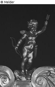Es handelt es sich um eine Aufsatzfigur, welche sich oben mittig auf dem Kaminschirm befand. Die Figur zeigt den nackten Amor, der seinen linken Arm hebt und einen Pfeil hoch hält. In seiner rechten Hand hält er seinen Bogen und streckt den Arm nach hinten.