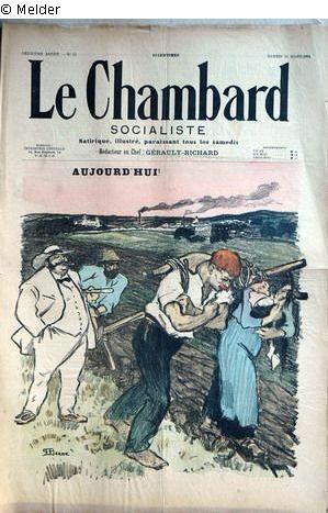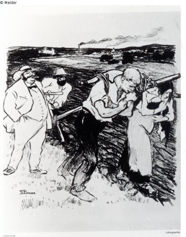 "Der feiste Großgrundbesitzer inhaliert genüsslich seine Zigarre. Er hat die Hände in den Taschen seines weißen Anzuges vergraben, den Bauch herausgestreckt und Fliege und Sonnenhut kennzeichnen ihn als modernen Sklavenhalter. Weiße Kleidung heißt, man wird nicht schmutzig bei der Arbeit und man hat Waschpersonal. Neben zieht ein Landarbeiter mit dem Holzpflug Furchen durch den Acker. Unter dem Joch sind ein Arbeiter, der wütend die Fäuste ballt und seine Frau, die einen Säugling in den Armen hält, eingespannt. Im Hintergrund eine Fabrik mit rauchenden Schloten, die Eigentumsverhältnisse sind das Problem." (UW)