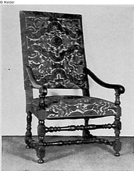 Dunkel gebeizt. Gedrechseltes Gestell aus Vierkant und Baluster mit gedrechselten Querstäben, geschwungene Armlehnen. Der Bezug mit bunten Blumen-, Frucht- und Rankenwerken sowie Kartuschen auf hellem Grund. Frankreich.