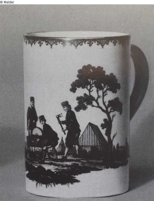 Zylindrische Form mit ohrförmigem Bandhenkel. Auf der Stirnseite in polychromer Malerei figürliche Szene in flacher Landschaft mit Gebäuden und Baum: zwei Bergleute mit Axt stehen neben einem Schleistein, den ein dritter Bergmann dreht. Links davon zwei weitere Bergleute im Gespräch. Auf der rechten Seite ein Förderschacht mit Wunde, daneben ein Bergmann. Auf der übrigen Fläche bunte Streublumen; am Lippenrand Goldspitzenkante.