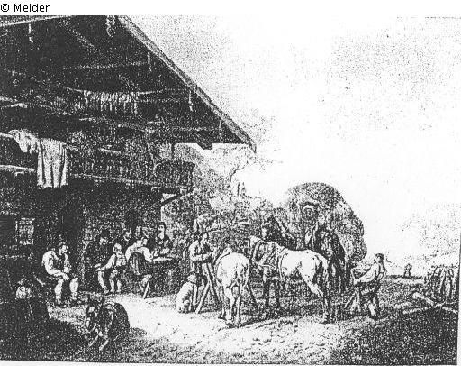 zahlreiche Gäste und Landlaute vor dem Tiroler Wirtshaus, hochbeladener Erntewagen und Pferde an der Krippe, im Hintergrund Landschaft; signiert und datiert: 1827