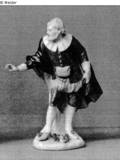 Aus einer Folge italienischer Komödianten. Die rechte Hand hat er halb erhoben, in der linken gestreckten Hand hält er die Kappe. Der Kopf ist nach rechts gedreht. Kopfhaar und Vollbart sind blond. Er trägt ein rotes Wams mit goldenen Knöpfen und Borten, weiße plissierte Manschetten und ebensolche Kragen, lila Tasche an purpurnem Gürtel, lila gefütterten schwarzen Mantel, rote Kappe, grüne Kniehosen mit goldener Einfassung und beigefarbener Plüderung um die Hüften, weiße Strümpfe und blaßgelbe Schnallenschuhe. Natursockel und Baumstumpfstütze sind weiß und mit purpurn staffierter Blume und grünen Blättern belegt. Schwertermarke.