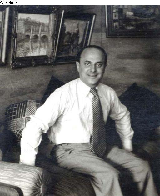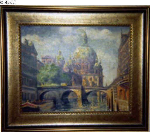 Photographie (um 1936) von David Friedmann in seiner Berliner Wohnung, mit den vermissten Gemälden "Schloßbrücke und Zeughaus" und "Berliner Dom"