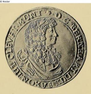 Bernhard von Sachsen-Jena. 1662 – 78. Fünffacher Golddukat. 1673. Vorders.: Brustbild. Rücks.: Wappen und Umschrift: DEO DUCE COMITE FORTUNA.