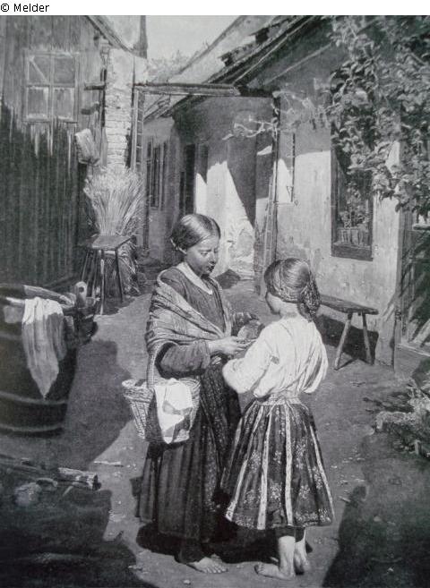 Bettelkinder (Vorstadtmädchen / Zwei arme Mädchen teilen ihr Brot)