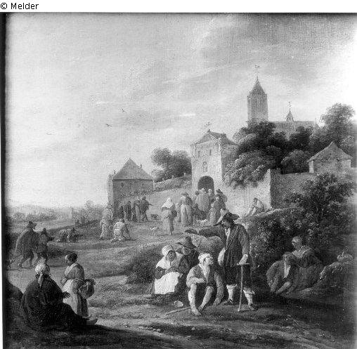 Bettler vor einem Kloster