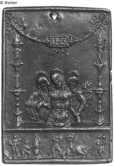 Rechteckige Plakette, ringsum schmale Randleiste, oben in der Mitte eine Durchbohrung. Der Leichnam Christi ragt bis zu den Hüften aus dem Sarkophag, an dessen Vorderwand predellenartig ein antikes Stieropfer gegeben ist. Christus wird von Maria und Johannes gestützt, die klagend hinter dem Sarkophag stehen. Rechts und links rahmen hohe Kandelaber die Szene ein, dazwischen hängt oben eine Girlande mit einem Täfelchen, darauf liest man die Inschrift IHS. Nach der ikonographischen Studie von Saxl (Journal of the Warburg Institute II, 1938/39, S. 350) ist der Sarkophag wie ein Altar behandelt, und die Szene zeigt eine Analogie zwischen heidnischem und christlichem Opfer.