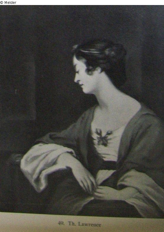 Felicia Hemans, britische Poetin (1793 – 1835); Lepke 1936: Halbfigur, nach links sitzend, den rechten Arm auf die Sessellehne gelegt. Sie trägt ein weißes Kleid und braunen Mantel; im Haar ein rotes Band, vor der Brust zwei Rosenknospen. Lwd. Gr. 90x70 cm. G.-R.; gerahmt;