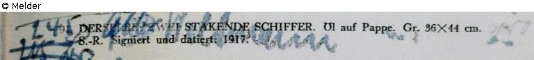 Sammlung Eduard Fuchs, Berlin-Zehlendorf bis 1933; Beschlagnahmung durch die Gestapo am 25.10.1933; Versteigerung Rudolph Lepke, Katalog 2114, 16. und 17.06.1937, Nr. 91 („Zwei stakende Schiffer, Öl auf Pappe, Größe 36 x 44 cm, Silberrahmen“); dort ersteigert von dem Kunsthändler Julius Weltmann (Tile-Wartenberg-Straße 29, Berlin) laut annotiertem Katalog der RKD Den Haag (Niederländisches Institut für Kunstgeschichte) für 245,- RM (Schätzpreis 150,- RM); Verbleib unbekannt