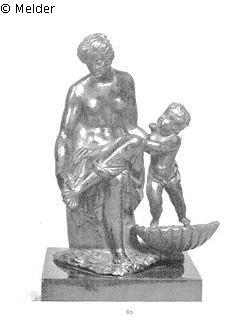 Venus mit Amor, sitzend, mit der rechten Hand den übergeschlagenen linken Fuß fassend; neben ihr auf einer großen Muschel stehend ein kleiner Amor, den sie mit der linken Hand hält. Dunkelbraune Lackpatina. Dunkler Bronzesockel. Padua.