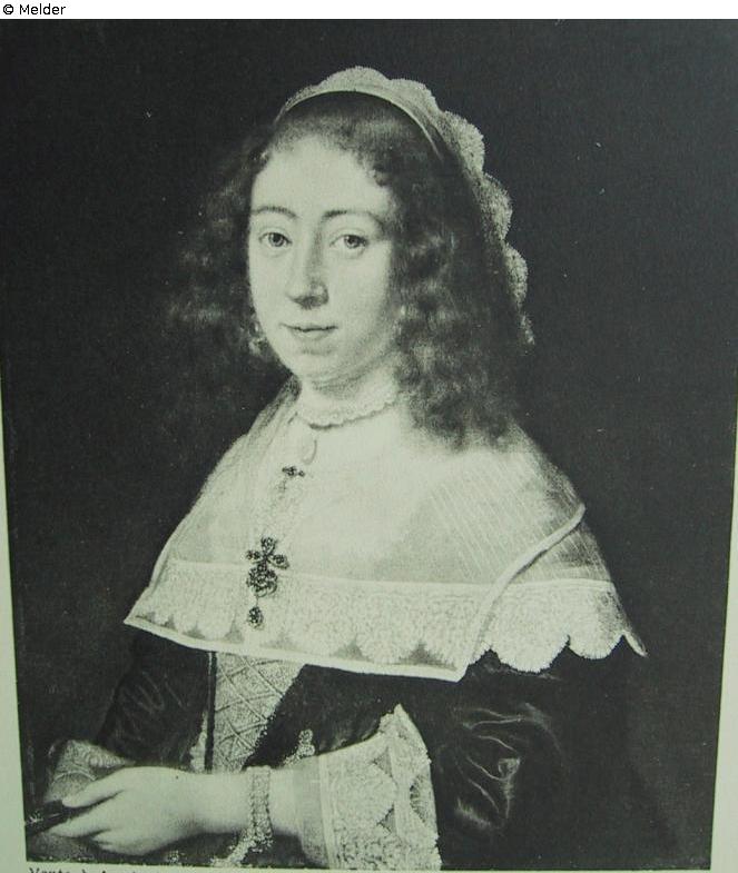 Spitzenhaube in ihrem blonden, lockigen Haar. Sie trägt ein schwarzes Kostüm mit einer Brosche an der Brust. Außerdem eine große Halskrause mit glänzendem Verschluss und Manschetten mit Spitze