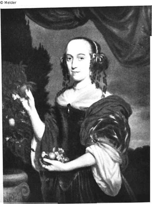 Halbfigurenbild en face, den Körper leicht nach links gewandt und mit den Händen Blüten und Früchte pflückend. Bauschiger Umhang um das eng anliegende Kleid, Perlenschmuck in den in Locken auf die Schulter fallenden Haaren. Oberer Abschluß durch Vorhang. Goldrahmen. Vollbezeichnet und 1667 datiert.